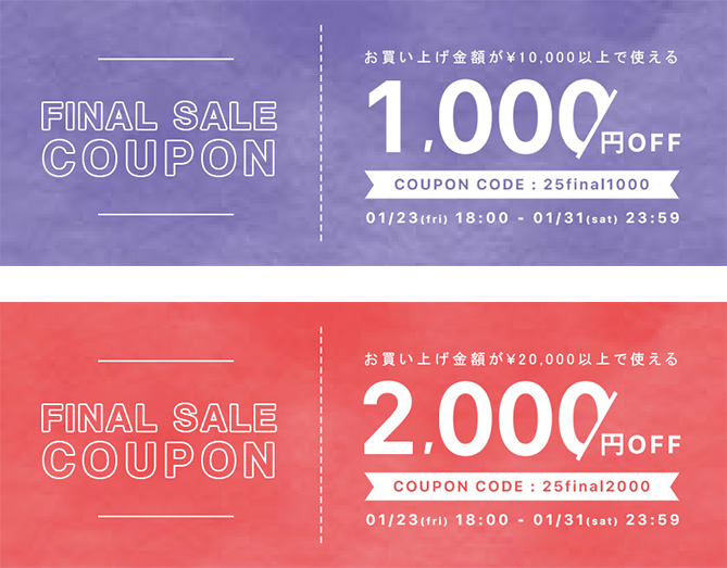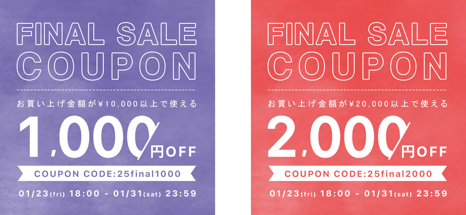 FINAL SALE COUPON 最大¥2,000 OFFクーポン配布中!! 《期間》 01 / 23 ( fri ) 18 : 00 - 01 / 31 ( sat ) 23 : 59 --------------- 【¥20,000以上ご購入で使える】 ¥2,000 OFFクーポン クーポンコード:25final2000 --------------- 【¥10,000以上ご購入で使える】 ¥1,000 OFFクーポン クーポンコード:25final1000 --------------- ※こちらのクーポンコードを決済画面で入力ください。 ※他クーポンとの併用不可
