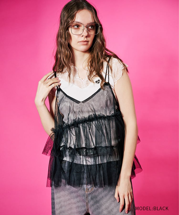アシメトリーフリルチュールキャミTOPS (BLACK) CQ-48105