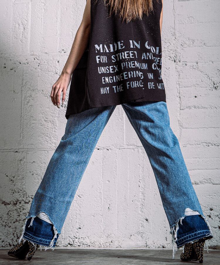 リメイクのワイドストレートデニムパンツ。